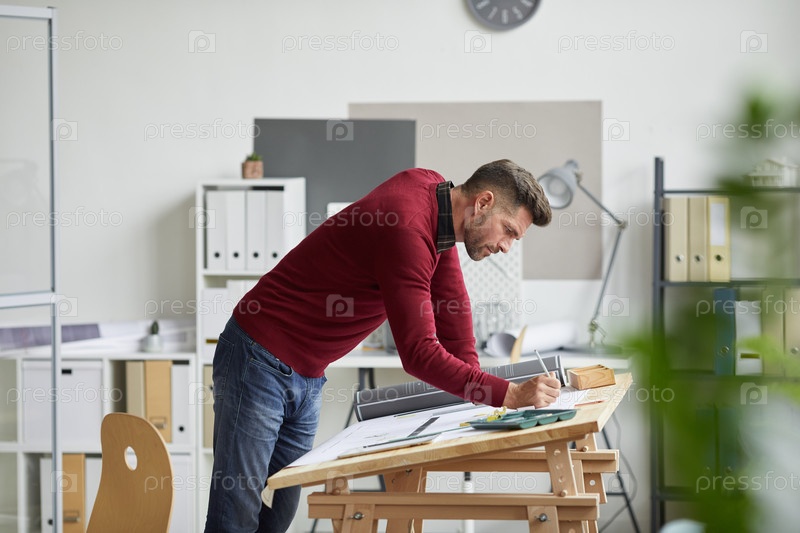 Бородатый архитектор работает в офисе