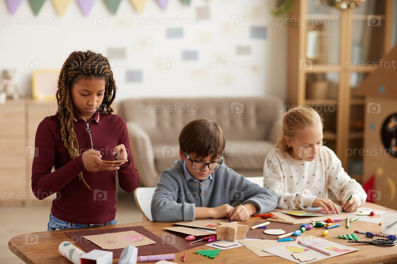 Девочка, фотографирующая изображение на уроке искусства