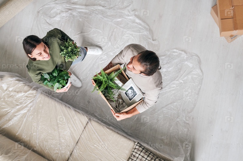 Обзор счастливого молодого человека и женщины с зелеными домашними растениями