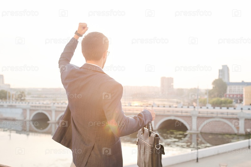 Задний вид молодого успешного бизнесмена с кожаной сумочкой, выражающей триумф