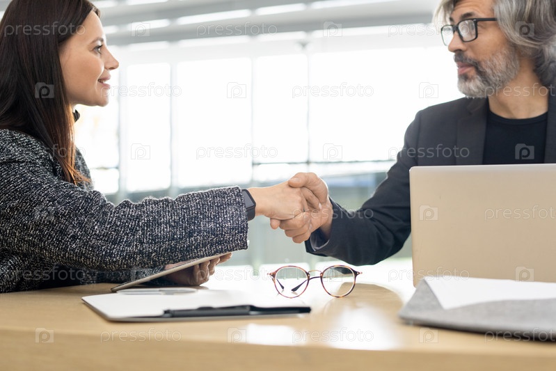 Пожимание рук молодых и зрелых бизнесменов, смотрящих друг на друга