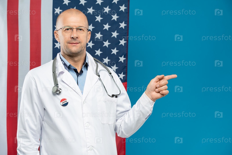 Американский мужчина со стетоскопом на шее и знаком на груди, указывающим вперед