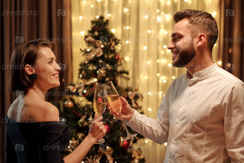 Боковой вид молодой радостной элегантной пары, смотрящей друг на друга во время тоста