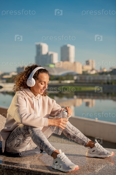 Молодая жаждающая спортсменка наслаждается пресной водой и расслабляющей музыкой в наушниках