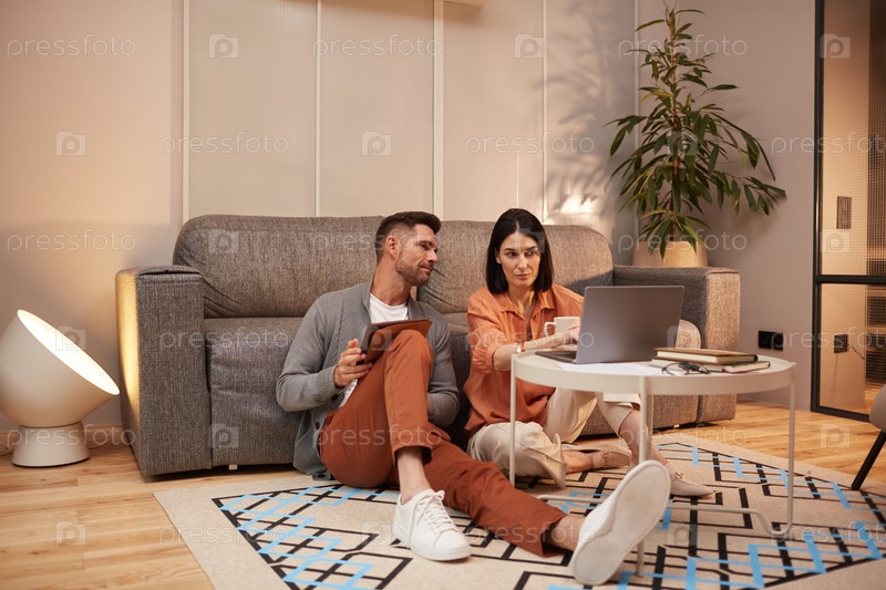 Супружеская пара, использующая современный ноутбук дома