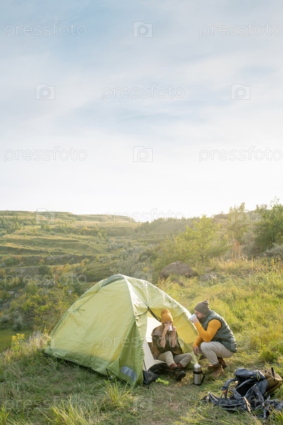 Молодой человек прижимается к палатке, где его жена отдыхает и оба пьют горячий чай