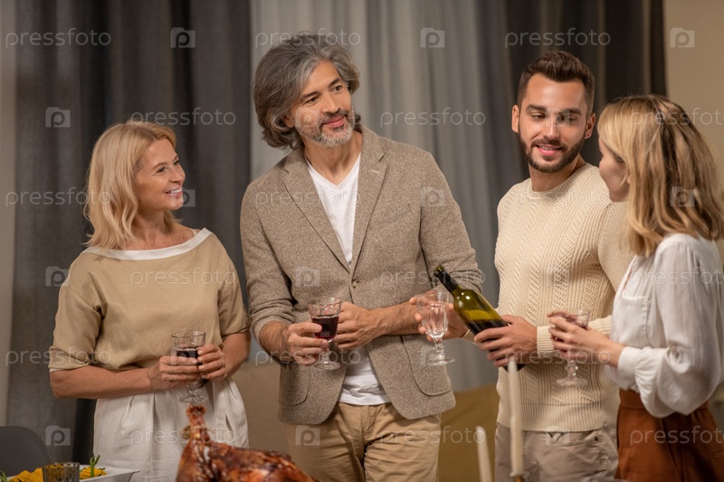 Счастливая зрелая пара со стаканами вина и молодой человек, смотрящий на блондинку