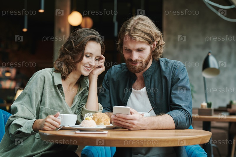 Портрет серьезного современного парня с бородой, сидящего за круглым столом в лофт-кафе и звонившего по мобильному телефону