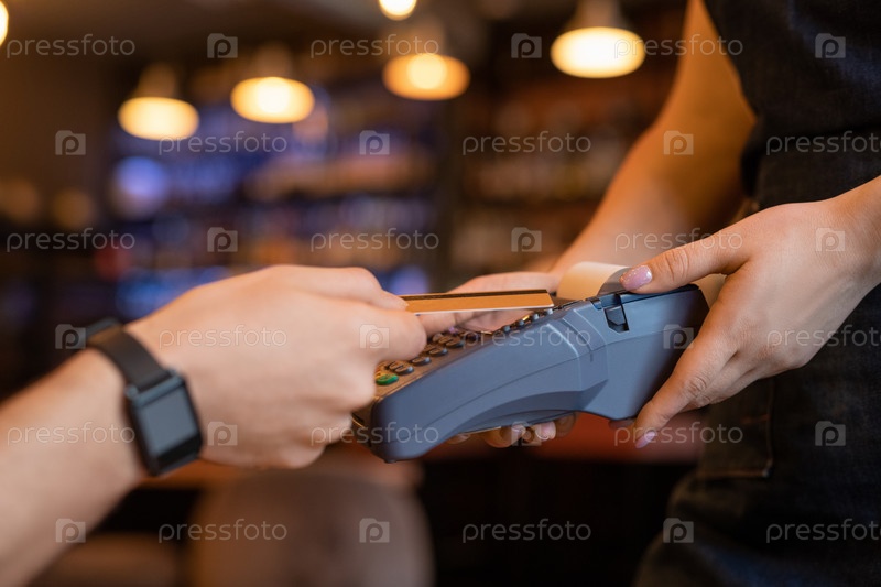 Современный молодой клиент, держащий пластиковую карту на платежном терминале