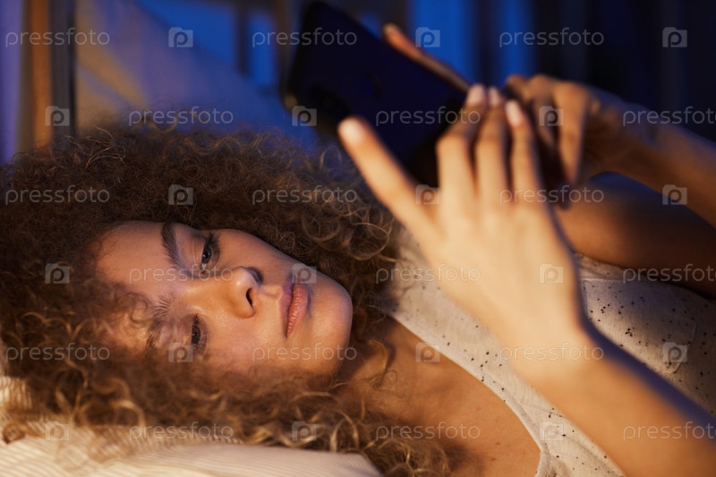 Молодая женщина с кудрявыми волосами отправляет сообщения по смартфону ночью