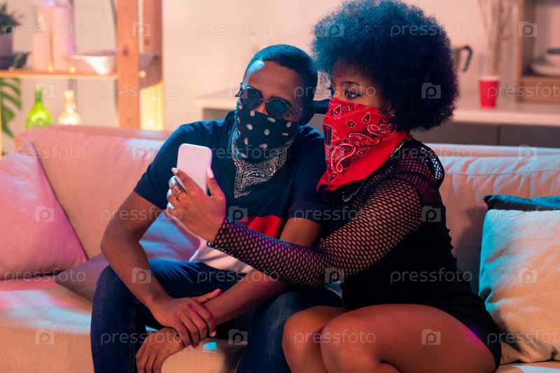 Молодая африканская пара в красно-черных банданах на лице делает селфи на диване