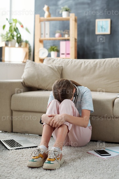 Несчастная девочка-подросток держит лицо между колен, выражая печаль
