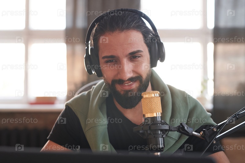 Горизонтальный средний крупный портрет счастливого молодого взрослого мужского блогера с бородой на лице, одетого в наушники и смотрящего на экран ноутбука