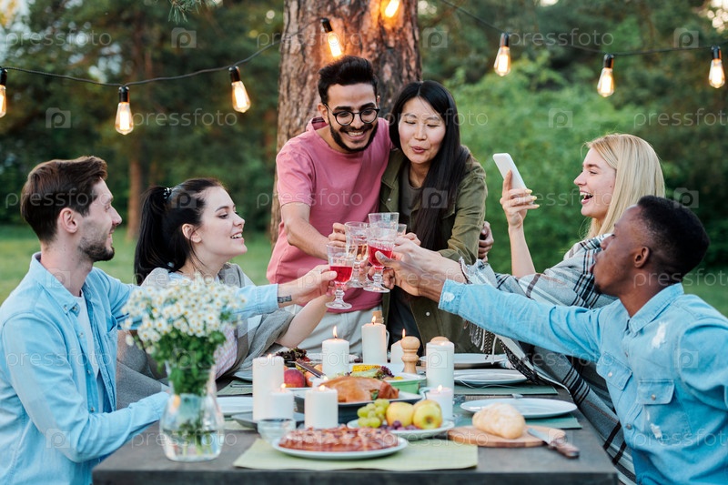 Группа межкультурных веселых друзей, собравшихся вместе за подаваемым столом
