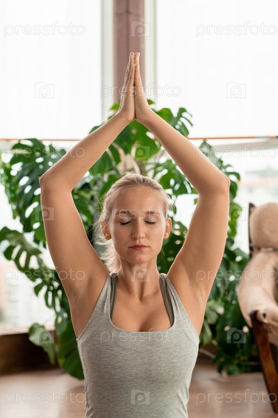Молодая активная женщина, сохраняющая равновесие с объединенными руками над головой