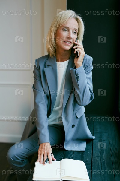 Улыбающаяся зрелая деловая женщина, разговаривающая по телефону