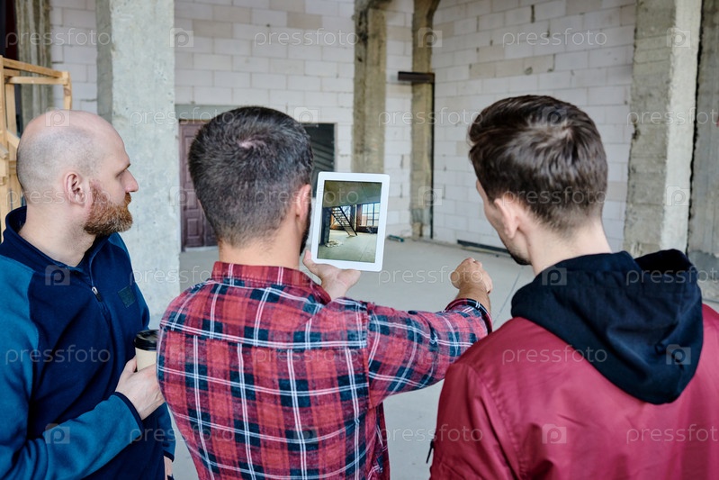 Строитель с планшетом показывает своим коллегам, где они должны сделать новую лестницу