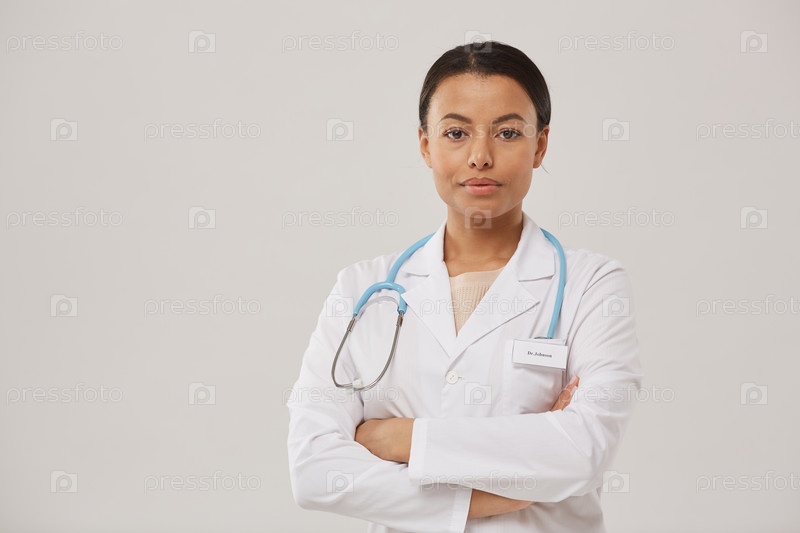 Женщина-доктор, позирующая на молодом белом