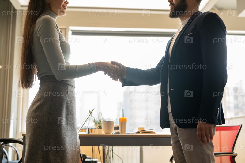Боковой вид двух молодых коллег в повседневной одежде, рукопожатие против окна