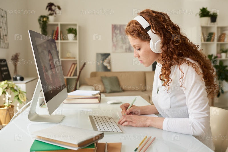 Концентрированная кудрявая студентка в наушниках сидит за столом и записывает информацию, сказанную онлайн-репетитором