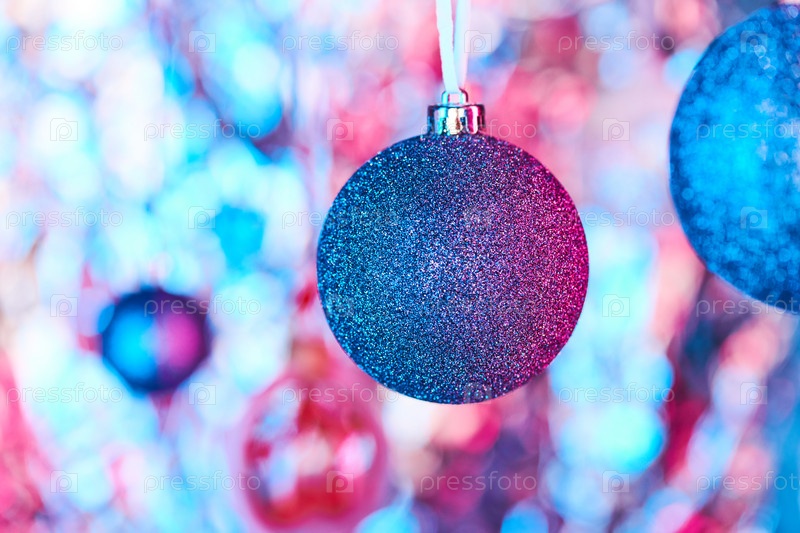Голубое рождественское украшение покрыто серебряными блесками, висящими перед камерой