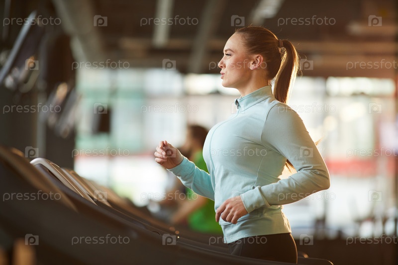 Молодая женщина, бегущая на беговой дорожке Side View