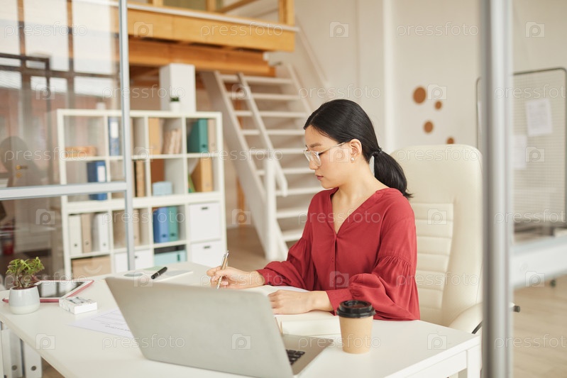 Успешная азиатская бизнесвумен, работающая за столом