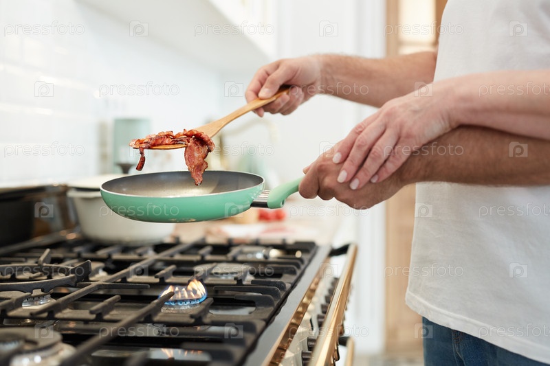 Близкий снимок взрослой пары, готовящей бекон и яйца