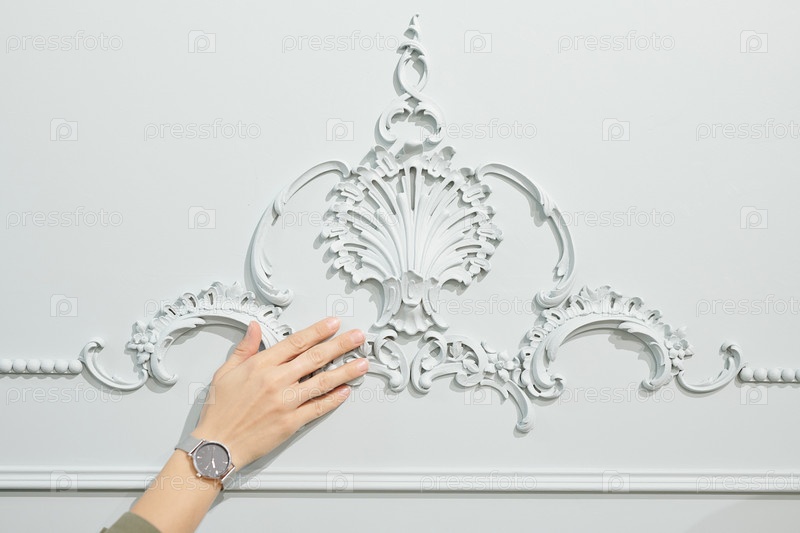 Рука женщины-клиента студии дизайна интерьера, касающейся орнамента на стене