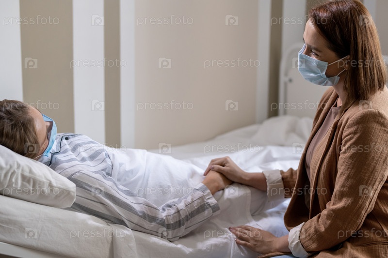 Молодая женщина в защитной маске держит свою больную подругу с ковидом за руку