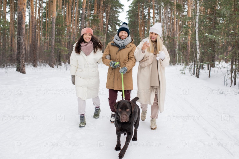 Веселый молодой человек и две девушки в зимней одежде следуют за черным ретривером