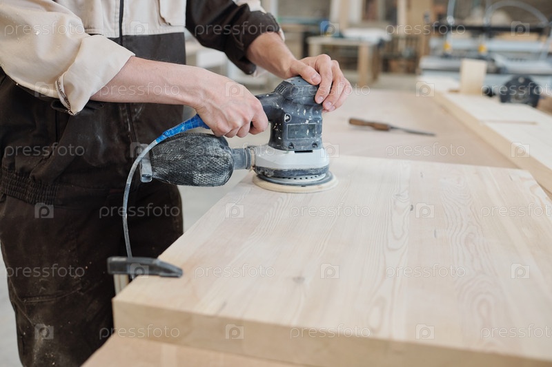 Молодой человек в рабочей одежде обрабатывает поверхность деревянной доски с шлифовальной машиной