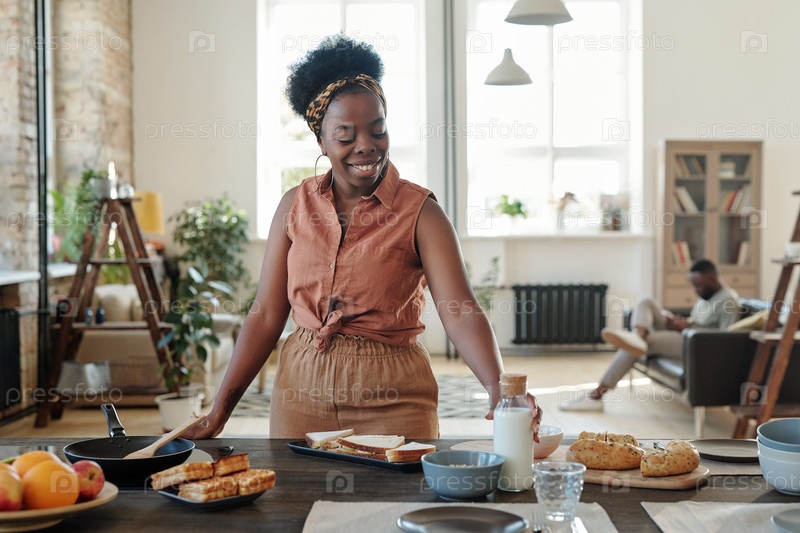 Молодая улыбающаяся африканская женщина в повседневной одежде берет бутылку молока во время приготовления пищи