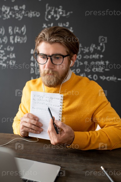 Вдумчивая учительница в желтом пуловере думает о новой лекции перед ноутбуком