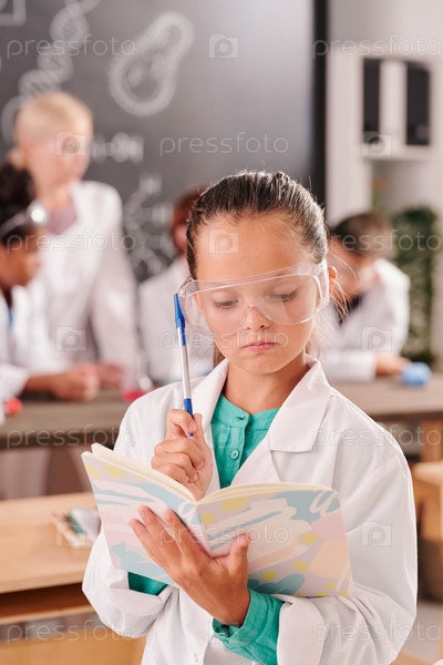 Умный ученик средней школы в белом халате и очках смотрит на записи
