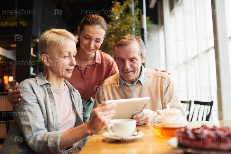 Семья использует планшетный компьютер в кафе