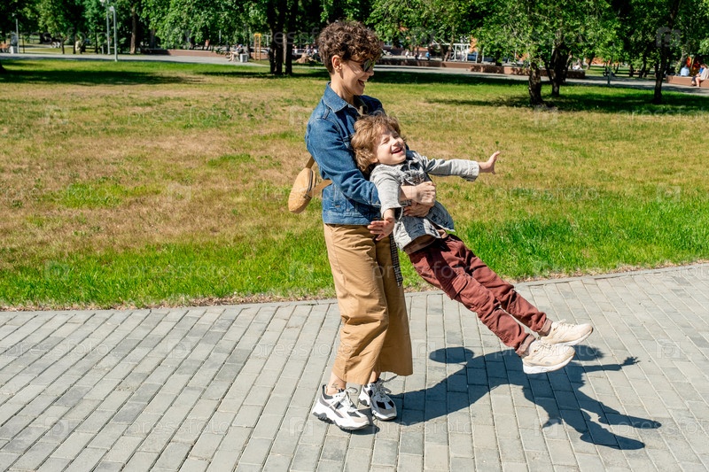 Счастливая молодая женщина смеется, вращаясь вокруг своего очаровательного маленького сына снаружи