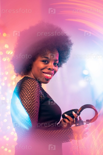Довольно молодой веселый женский диджей с наушниками, наслаждающийся диско-вечеринкой