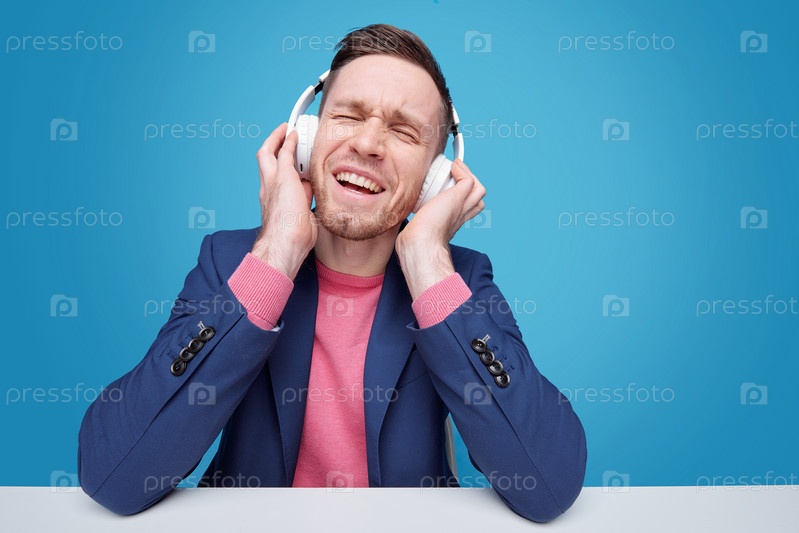 Веселый и взволнованный молодой человек с наушниками наслаждается своей любимой музыкой