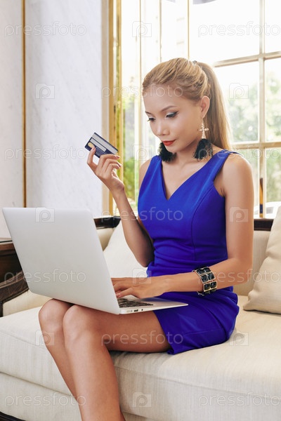 Молодая женщина покупает в Интернете