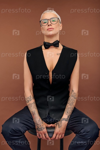 Молодая мужская женщина с короткими волосами, руками и телом, покрытыми татуировками