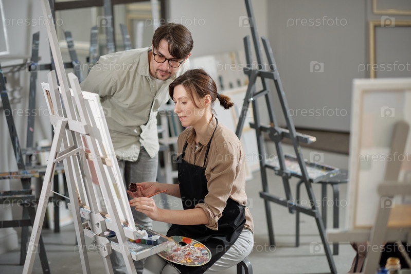 Тщательная девушка в фартуке, работающая над живописью и следующая советам своего учителя