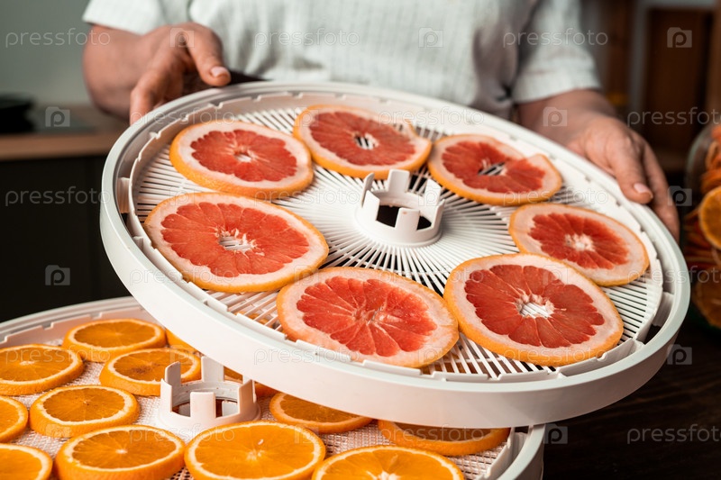 Домашняя хозяйка кладет в сушилку поднос с нарезанным грейпфрутом, на который положены оранжевые ломтики