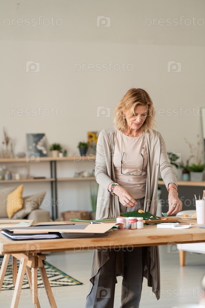 Красивая блондинка-дизайнер в сером элегантном casualwear, работающая за столом дома
