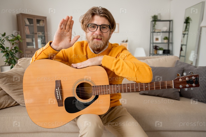 Молодой бородатый учитель приветствует свою онлайн-аудиторию в начале урока