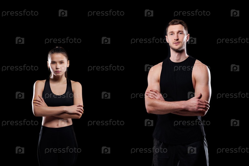 Серьезная молодая спортивная пара в активной одежде, скрестившая руки за грудь