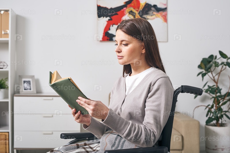 Молодая женщина-инвалид в повседневной одежде сидит на инвалидной коляске и читает книгу