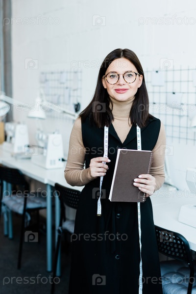 Молодая успешная самозанятая швея с измерительной лентой и блокнотом