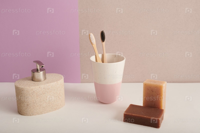 Натюрмортный снимок современных керамических аксессуаров для ванной с зубными щетками и мыльными палочками на розовом и светло-коричневом фоне, копирование пространства