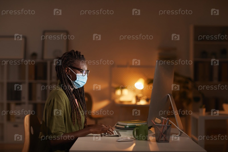 Афроамериканская женщина, носящая маску на рабочем месте